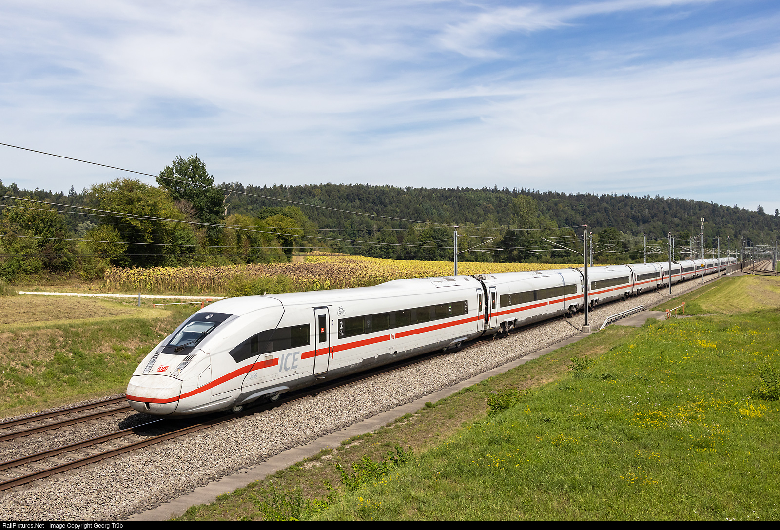 | At 200 km/h (124,3 mph) racing over the NBS (Neubaustrecke/new built line) Rothrist-Mattstetten (part of the Olten-Berne line), opened in december 2004, near Langenthal. ICE 4 highspeed train for 265 km/h # 9459 of the Deutsche Bahn, running as ICE 275 from Berlin Ostbahnhof via Braunschweig-Göttingen-Frankfurt-Mannheim-Basel-Bern-Thun-Spiez to Interlaken Ost (about 760 kilometer in 9 hours 38 minutes). This 13 car train is 374 meter long and has 11550 kW. |