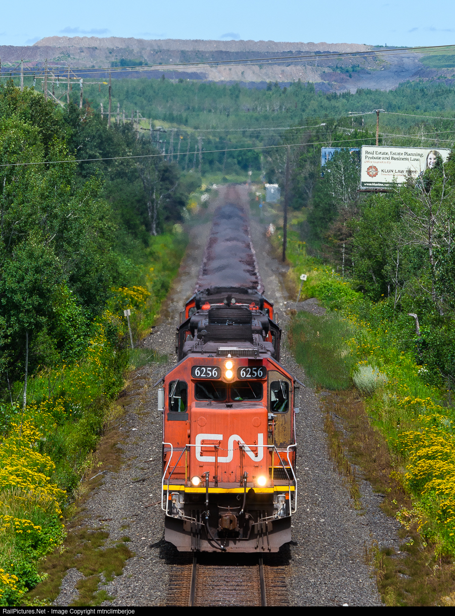 With tailings piles towering in the background, a pair of IC SD40-3's and a DMIR tunnel motor head south on the Rainy Sub through Virginia, Minnesota and are about to pass under the Route 169 overpass with a short train of taconite pellets from Minorca in tow, bound for Proctor. The train will meet U792, a train of empties from Two Harbors and bound for loading at Minorca, at the Virginia siding just on the other side of the overpass.