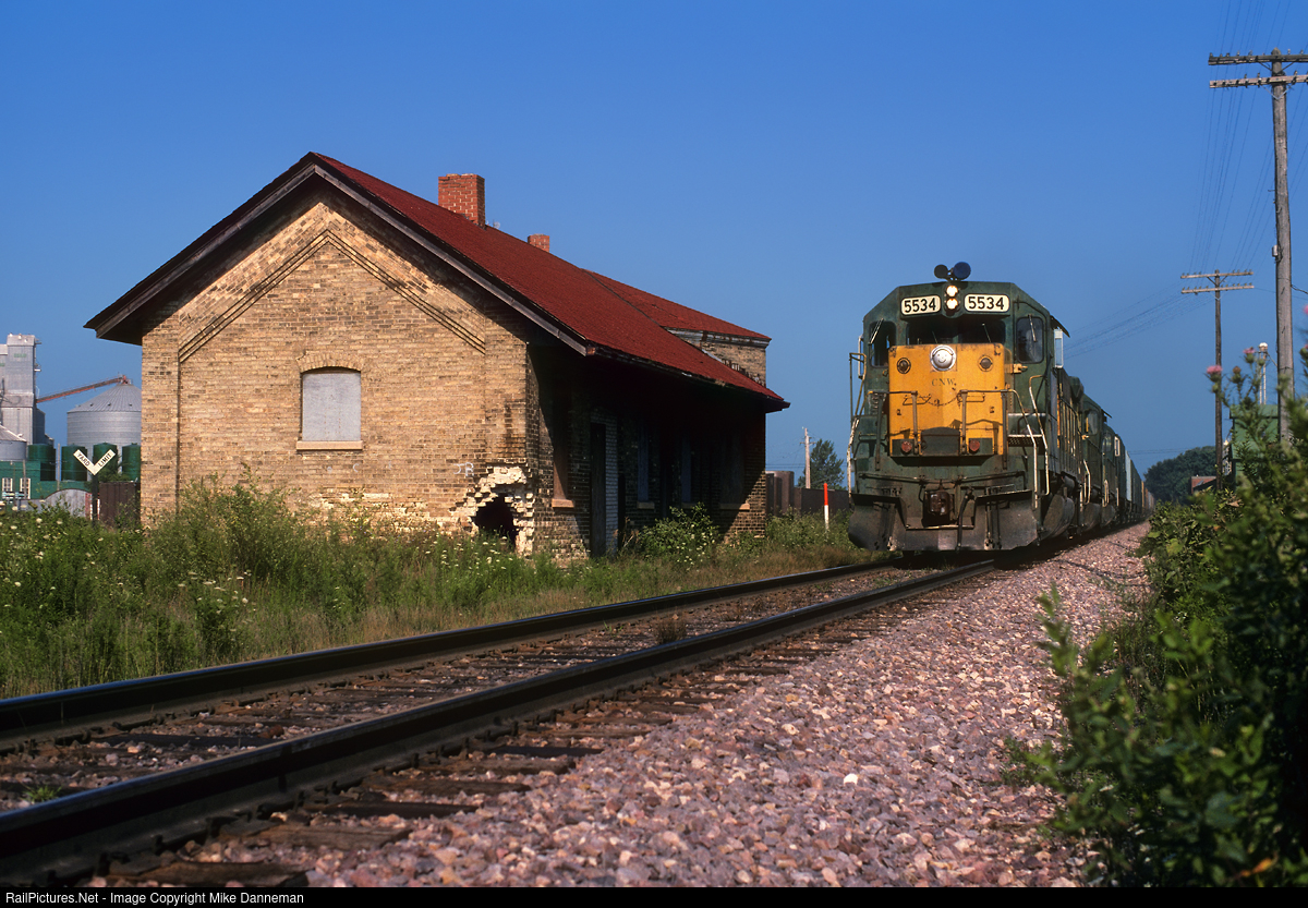 Chicago & Northern Western’s freight from Janesville is eastbound at Clinton, Wisconsin, passing the abandoned 1912 depot on the morning of August 12, 1995. This station at Clinton Junction stood at the crossing of C&NW’s Chicago to Janesville route, and Milwaukee Road’s “Southwestern” line between Racine and Kittredge, Illinois. The Milwaukee line was abandoned by the time of this photo.