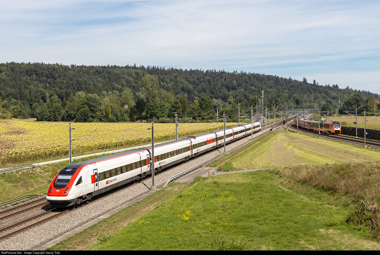 Interesting "parallel running" near Langenthal. On the left is "ICN" tilting train RABDe 500 # 035 of the SBB, racing with 200 km/h over the NBS (Neubaustrecke/new built line) and ABS (Ausbaustrecke/rebuilt line) from Olten to Solothurn, as train IC 520 of the line IC 5 from Rorschach via St.Gallen-Winterthur-Zürich-Olten-Solothurn-Neuchâtel-Yverdon les Bains-Geneva to Geneva Airport. On the right is a "Traverso" RABe 526 of the Südostbahn, running on the "old line" Olten-Burgdorf-Bern as IR 2366 of the line IR 35 from Chur via Zürich-Olten to Bern. This "Traverso" departed from Olten at 12.36 PM, the ICN at 12.40 PM, and has overtaken the Traverso up to here.