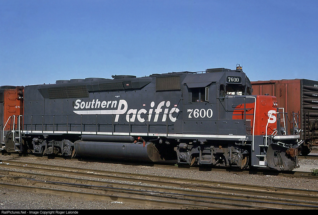 SP purchased in 1974, three GP40P-2s originally built for commuter service. In 1993 they were rebuilt and converted strictly for freight service by removing their steam generators. Originally built with L-shaped front windshield, retrofitted with standard EMD front windshield, Gyra and class lights removed and plated over.