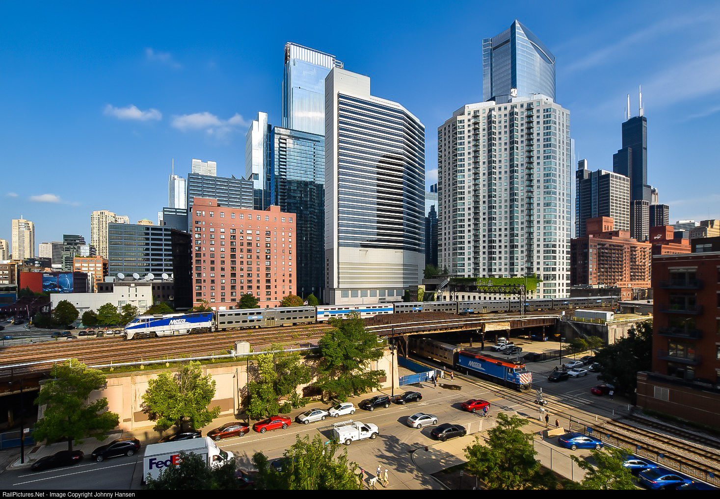 | The heart of rush hour is underway in Downtown Chicago while a UP-W line train departs Ogilvie Transportation Center above with F59PHI 82 while below a outbound MD-N line train departs Chicago Union Station with F40PH-2 124. |