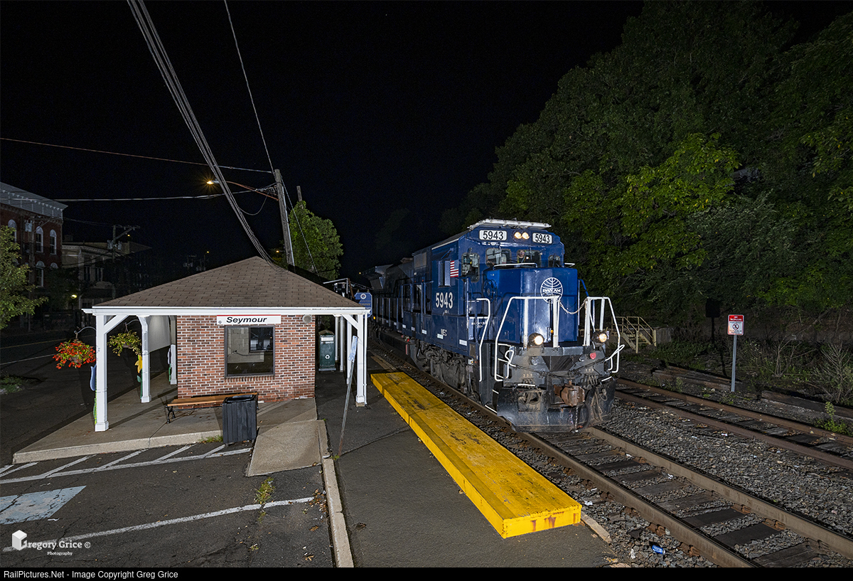 On the morning of August 26th, 2022, the CSX/Berkshire & Eastern Railroad (soon-to-be formerly Pan Am Railways) "PL-Extra", with GE B40-8 5943 leading, is seen coasting south past Seymour station on Metro-North Railroad's Waterbury Branch. The train was on its way to service Kerite Company, the railroad's only customer on the branch, located on the siding adjacent to the main in this photo. The crew also retrieved Metro-North MoW hopper "MNCW 391", which was donated to the Railroad Museum of New England almost 2 years ago. Kerite is usually only serviced one to two times annually, making freight trains on the upper Waterbury Branch a unique sight.