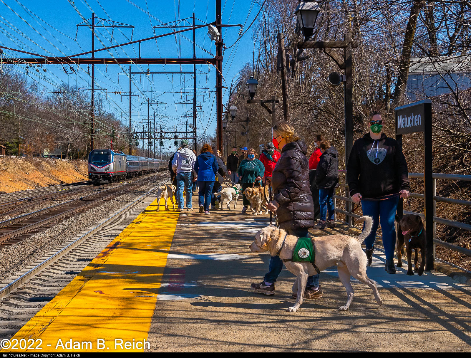| Seeing Eyes: Amtrak's Silver Star passes seeing eye dogs in training at NJ Transit's Metuchen station on March 13, 2021. |