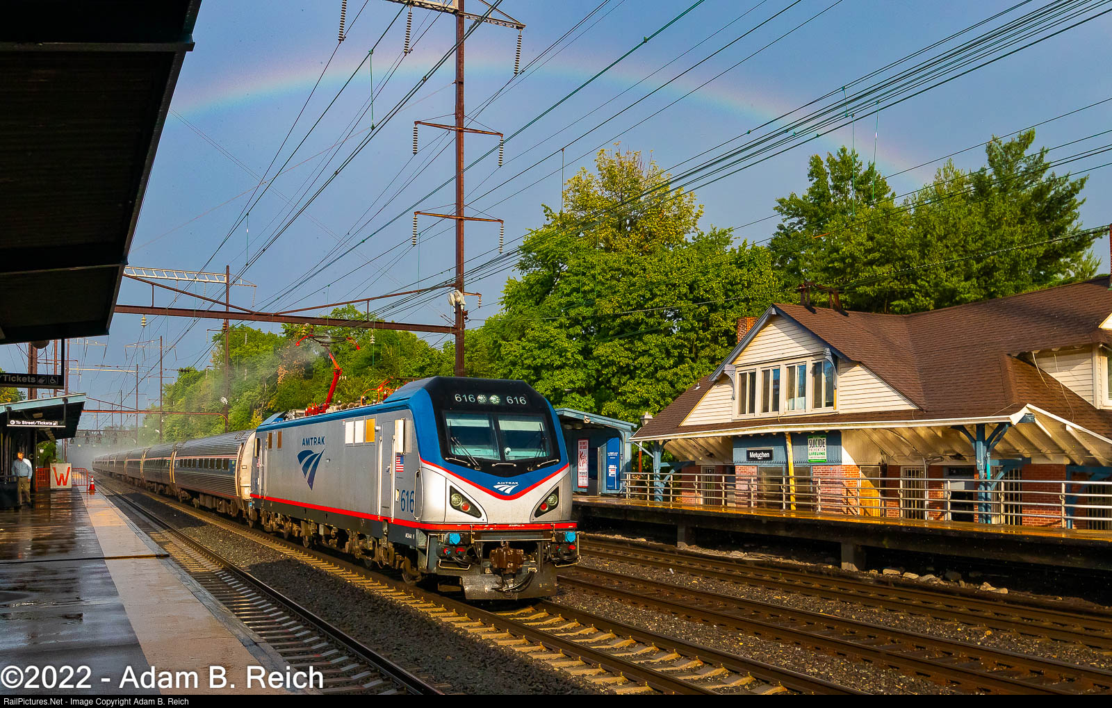 A sun shower gave rise to a rainbow over Metuchen station just as Amtrak
