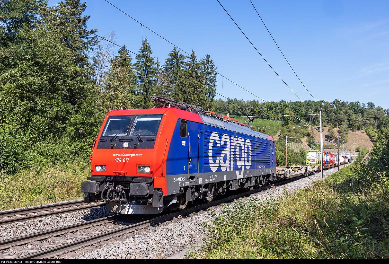 | Siemens ES 64 F4 Re 474 # 017 of SBB Cargo International is pulling the northbound intermodal train 40026 from Mortara via Gotthard Base Tunnel-Basel to Rotterdam Walhavn, on the Bözberg south ramp between Brugg AG VL and Schinznach Dorf. The locomotive got a revision in Dessau last spring and looks like new. |