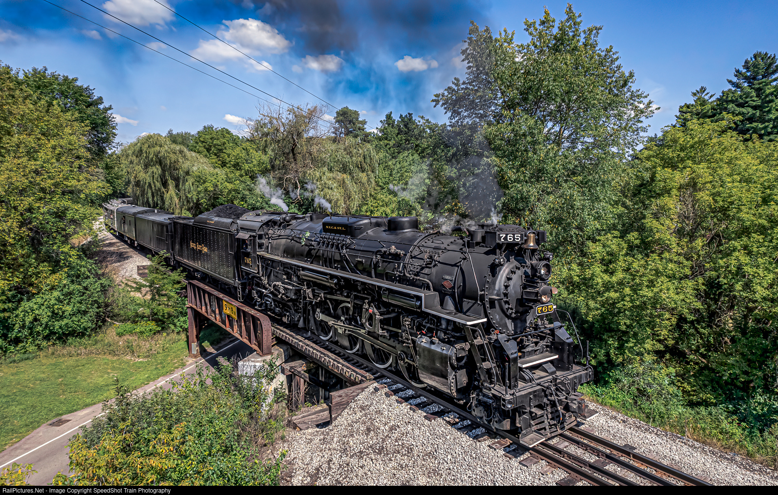 | NPR 765 - The Fort Wayne RR Historical Society Run from Edon Ohio to Hillsdale Michigan and back on August 27 2022. This was the Innaugural Indiana Rail Experience run. The 765 seen here, Returning Southbound. As it leaves Hillsdale Michigan , it crosses the narrow bridge over W Hallett Rd. |
