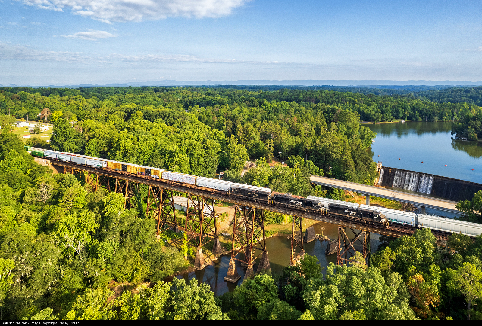 While NS 153 waits on the trestle, the hotshot NS 24Z passes it on the way north over the Saluda River near Greenville, SC.