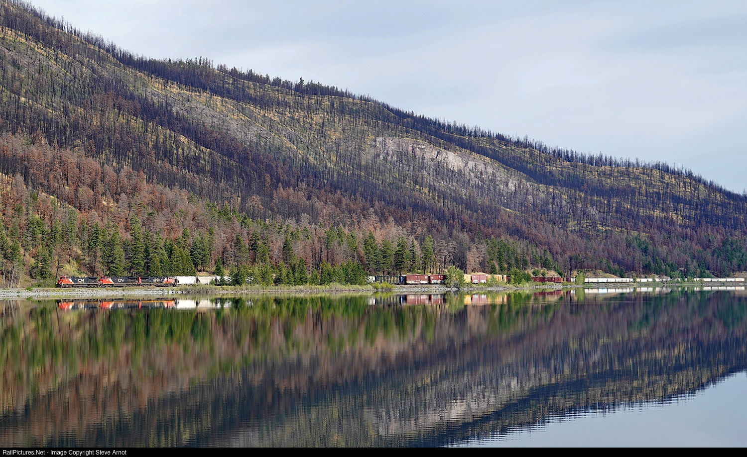 Dash 9-44CW 2678 leads CN 588 along the west shore of Monte Lake.