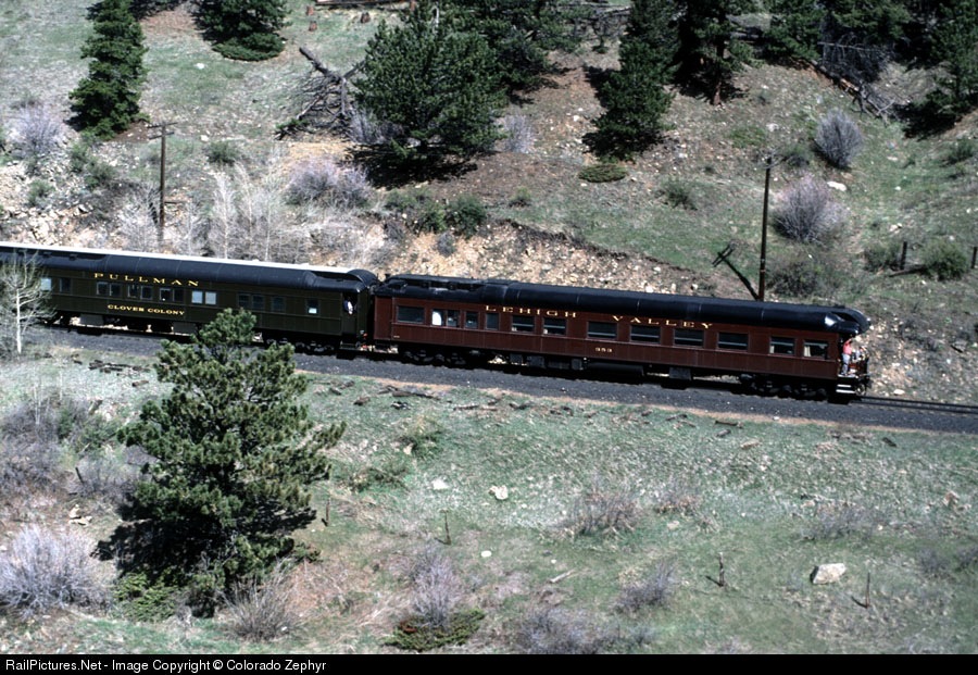 DRGW 3120 led Amtrak's wb California Zephyr account two PV's, CLOVER COLONY and LEHIGH VALLEY 353. Reknown Colorado RR photographer, Dick Kindig, was aboard LV 353.