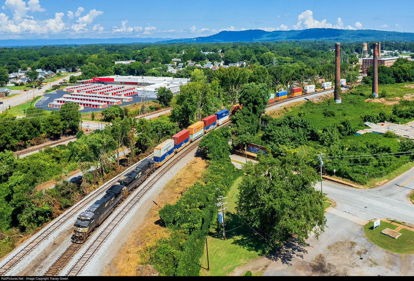 Stacks by Stacks. NS 243 brings a load of container empties past the remains of the F.W. Poe Textile Manufacturing Mill in North Greenville, SC. NS 243 is approaching the Greenville yard on its way south to Atlanta, GA. The Poe Mill closed in 1977 and burned in 2003, leaving only the two stacks. The building behind the stacks is the American Spinning Mill, now being converted to apartments and retail space. In the distance is Paris Mountain.