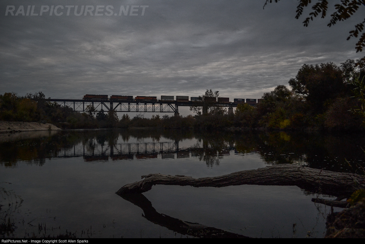 | A cool, quiet morning alongside a mellow San Joaquin River, is suddenly awoken by the approach of an east bound BNSF stack train as it races across the river in the very early moments of a fall morning.