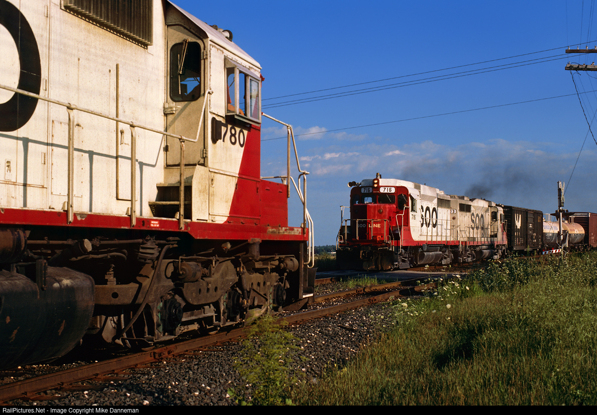 Soo Line train 11 meets train 18 at Rugby, Wisconsin, late in the afternoon of July 26, 1987. Train 11 is led by Soo EMD SD40 No. 780, while a pair of EMD GP30s built in 1963 powers train 11.