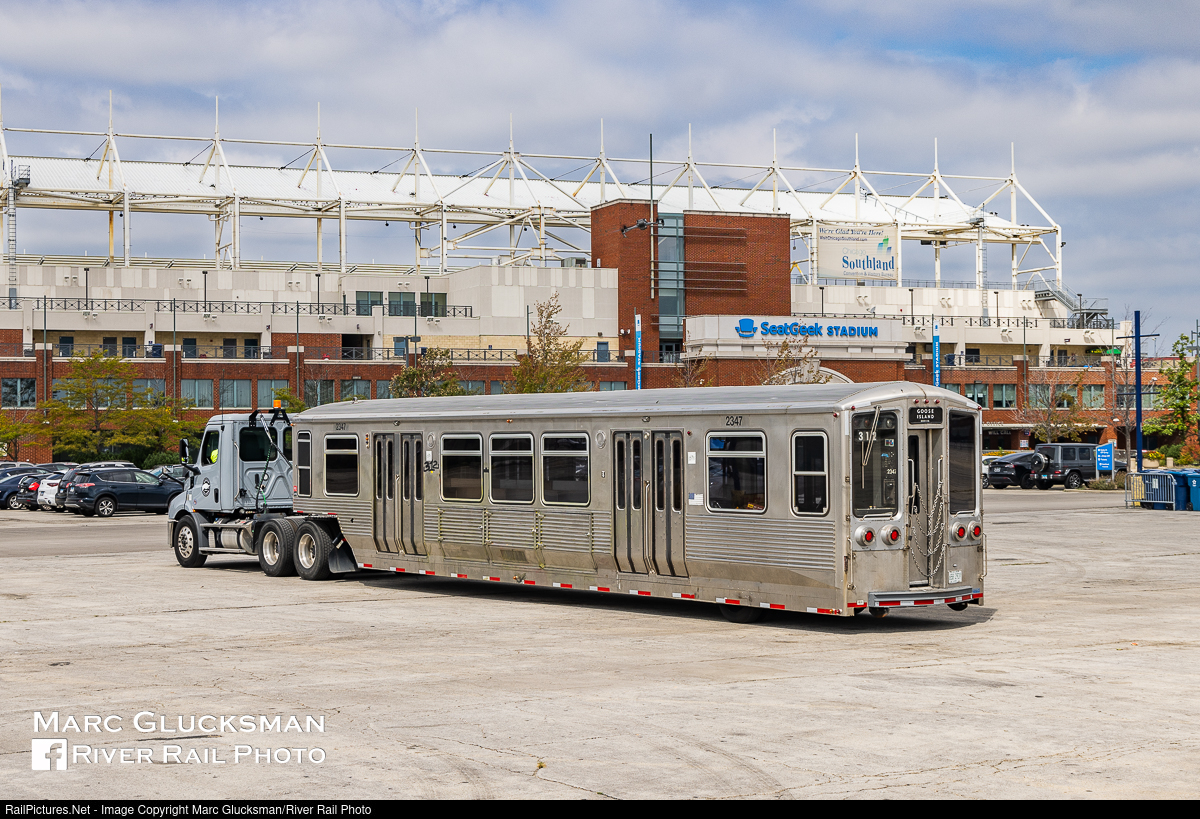 On This Budd, You Can Have A 312. A unique idea in mobile beverage service, Goose Island worked with Craftsmen Industries, Inc. to convert former Chicago Transit Authority car 2347 (1969-1970, Budd) into a road certified trailer. Inside, beer taps were installed, the underside was modified to use tires, and even the cars headlights now function as turn signals. Goose Island, based in Chicago, takes the vehicle around the area to various events and serve its signature "312" urban wheat ale, named after the telephone area code of downtown Chicago, Illinois. On Monday, August 29, 2022, the trailer is seen at Seatgeek Stadium in Bridgeview, Illinois, home of the MLS Chicago Fire amongst other teams, about to return to its garage after a very busy Sunday.