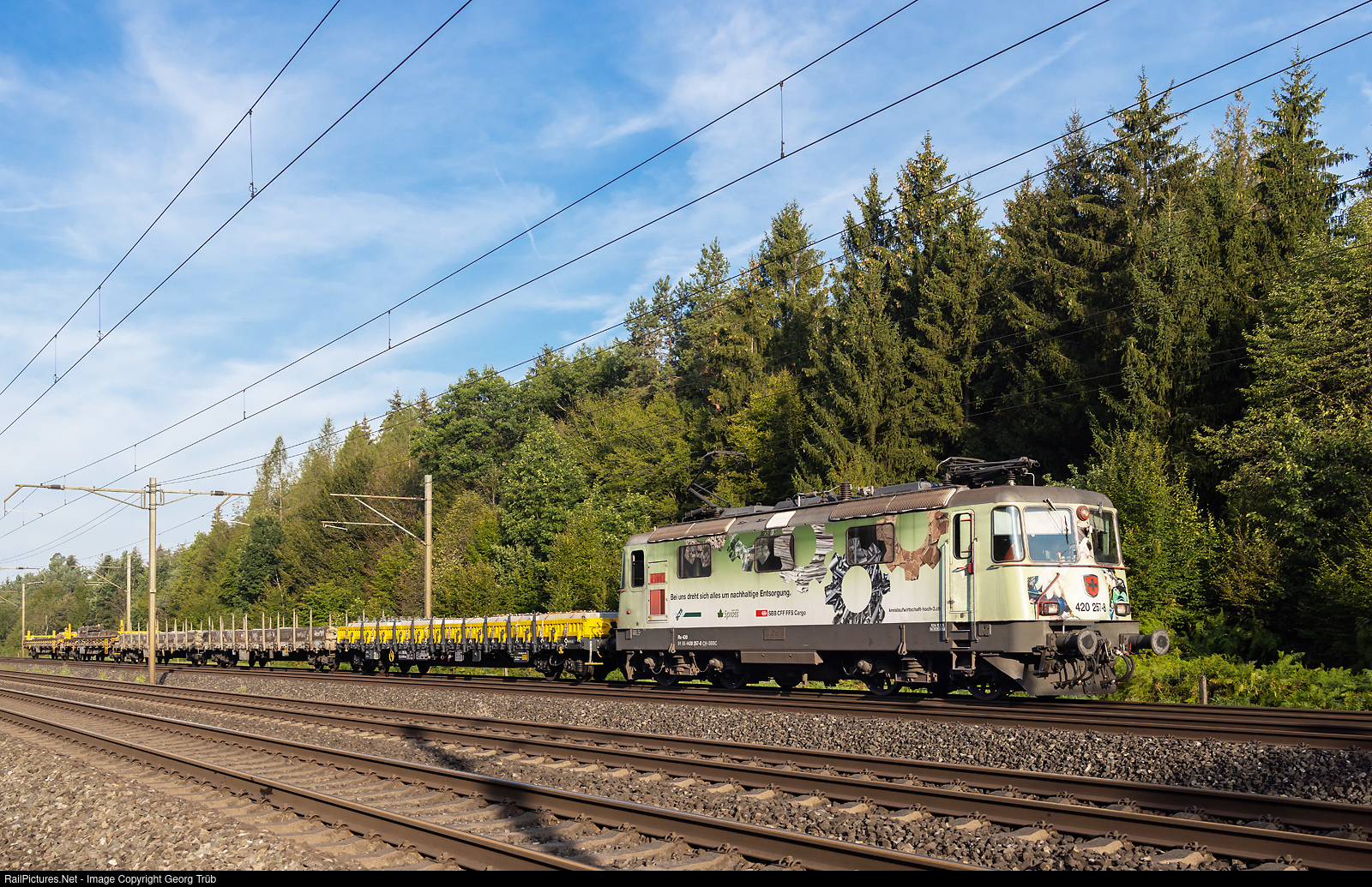 | R 420 # 257 of the SBB, in the publicity paint scheme for the recycling company Spross, is pulling freight train 62135 from Hägendorf via Olten-Heitersberg to the Limmattal shunting yard, between Aarau and Rupperswil. |