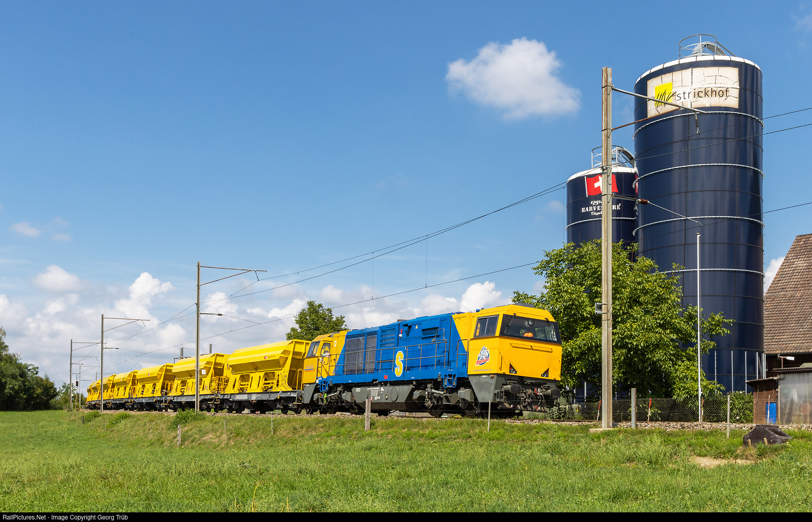 | Diesellocomotive Am 840 # 003 "RHINO 3" of the Scheuchzer company with a ballast train at Lantig, between Hettlingen and Winterthur. This weekend, the line between Henggart and Winterthur was closed down (bus replacement service) for rebuilding of the track. This locomotive of type G 2000-2 BB was built by Vossloh in Kiel/Germany in 2004 for the freight service between Chiasso/Domodossola and northern Italy for Swiss Rail Cargo Italy. In september 2013 the locomotive was sold to Scheuchzer, together with sisters 840 # 001 and # 002, now "RHINO 1" and "RHINO 2". |