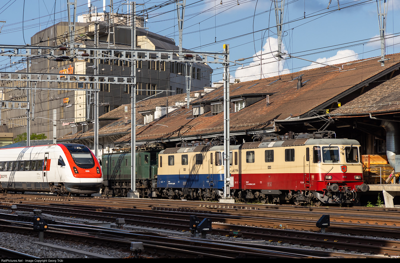 Swiss railway vehicles of different decades meeting in Winterthur, were 3 of them were built by the SLM, which site was a few meters from here only. Beside the old goods shed are former SBB Re 421 # 393 (Re 4/4 II # 11393, in the TRANS EUROP EXPRESS paint scheme) and Re 421 # 387 (Re 4/4 II # 11387 in the RHEINGOLD paint scheme) of the International Rolling Stock Investment Gmbh (IRSI). On the left is former SBB express train locomotive Ae 4/7 # 10997 of Swisstrain, built by SLM and MFO in 1933. On the left is ICN RABDe 500 # 041 (built 2005), leaving Winterthur as IC 532 of the line IC 5 from Rorschach to Geneva Airport across of Switzerland.