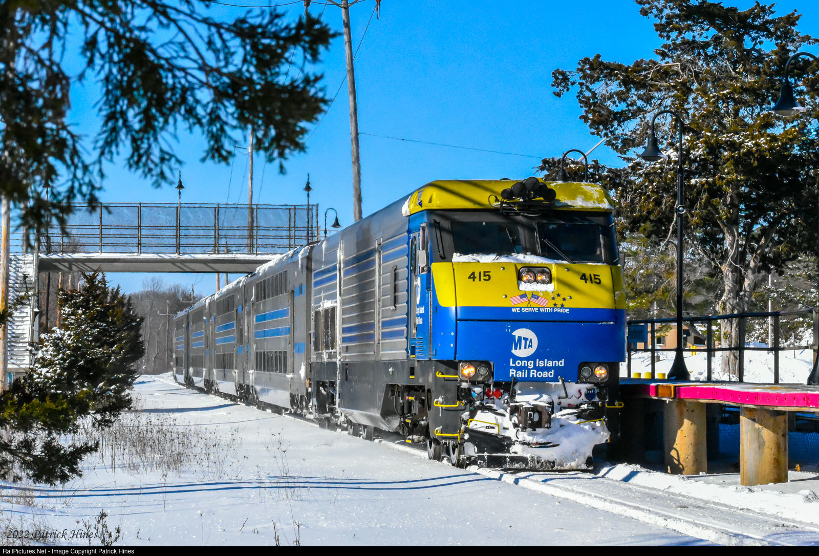 | After an intense snowstorm LI 415 pulls an Eastbound local into Northport station giving a horn salute. Out of frame is LI TC985, a jet snow blower waiting for 415 to clear Duke interlocking so they can proceed back West |