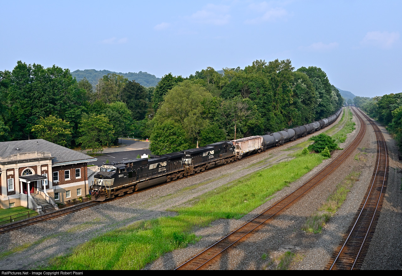 | A typical pair of NS Dash 9s lead ethanol empties from Sewaren, NJ west to Chicago. The train is passing the former PRR Sewickley station as the shadow of Sewickley Bridge encroaches on this early summer evening.