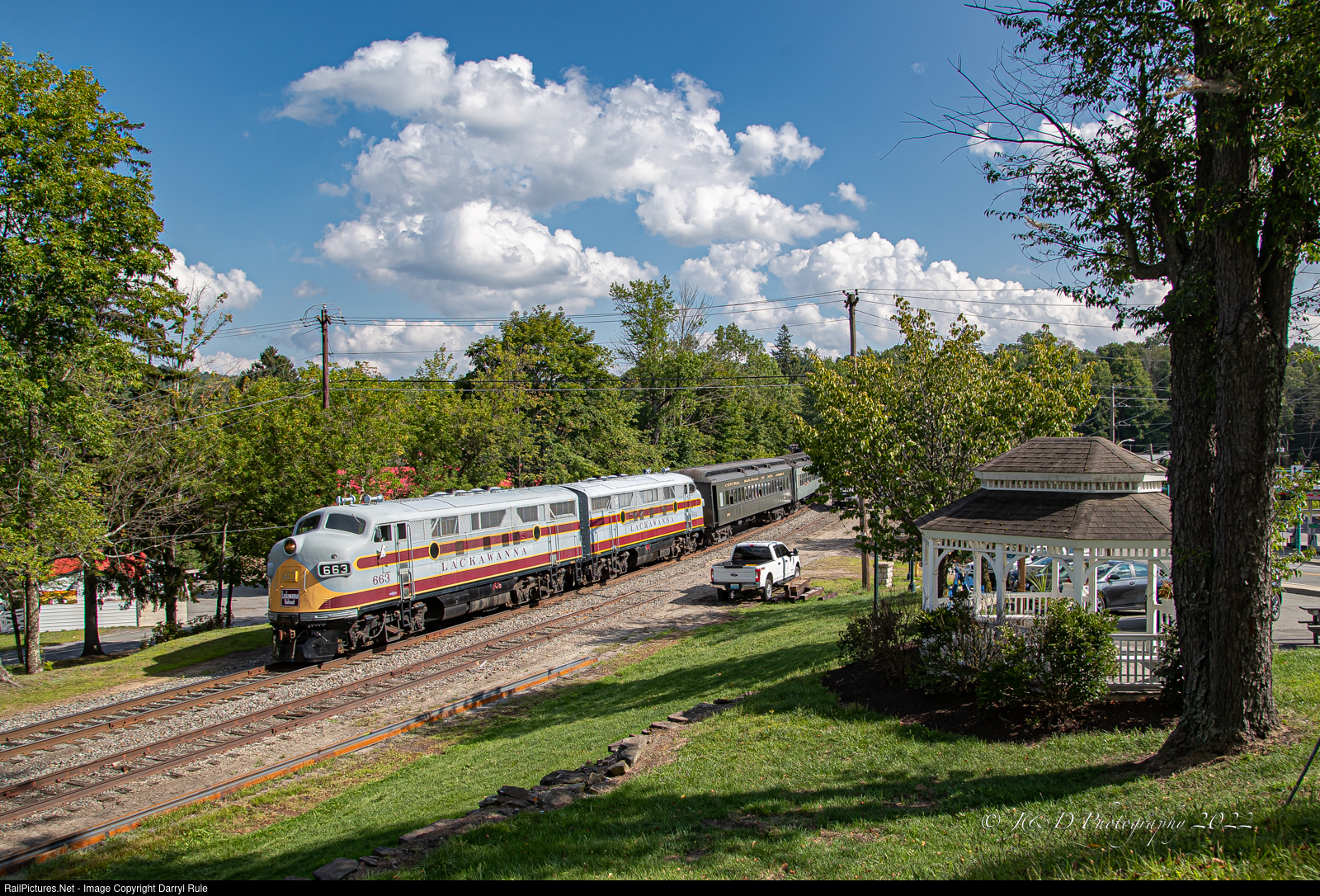 Steamtown's Cresco excursion has slowed to a crawl passing a work zone just east of the station at Moscow, PA. The Roatry Club gazebo adds a nice touch to the small mountain town scene.