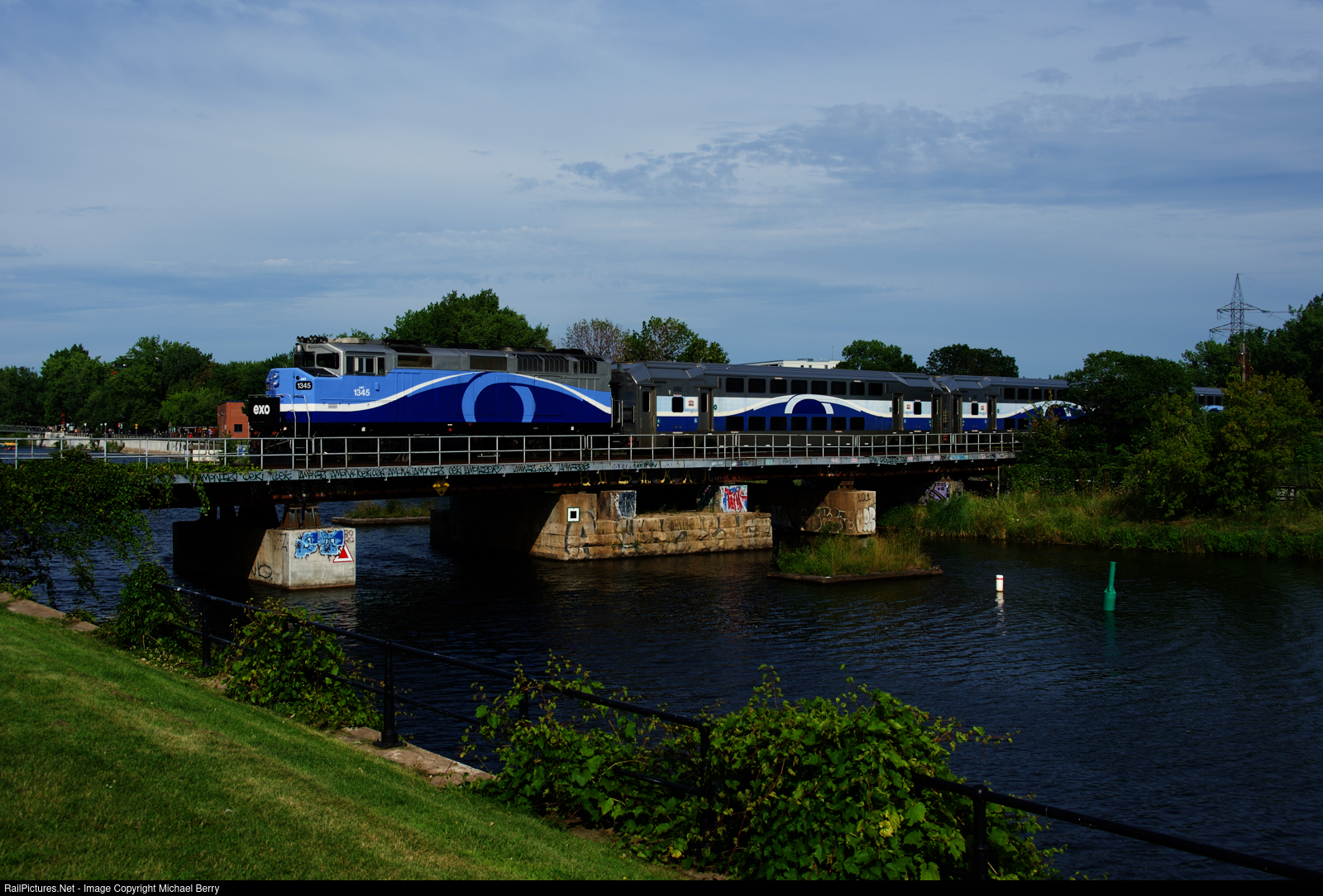 The first train of the afternoon for Mascouche from Central Station crosses the Lachine Canal with AMT 1345 and the usual three multilevel cars.