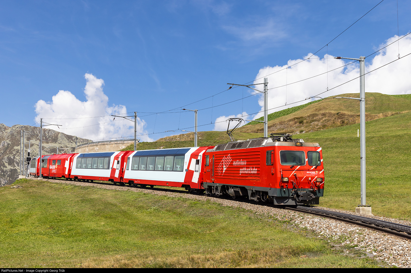 | Cogwheel locomotive HGe 4/4 II # 2 "Monte Rosa" of the Matterhorn-Gotthard-Bahn (MGBahn), built in 1990 for the Brig-Visp-Zermatt Bahn (BVZ), is pulling the 4-car PE (Panorama Express) 901 GLACIER EXPRESS from St.Moritz to Brig between Nätschen and Andermatt. |