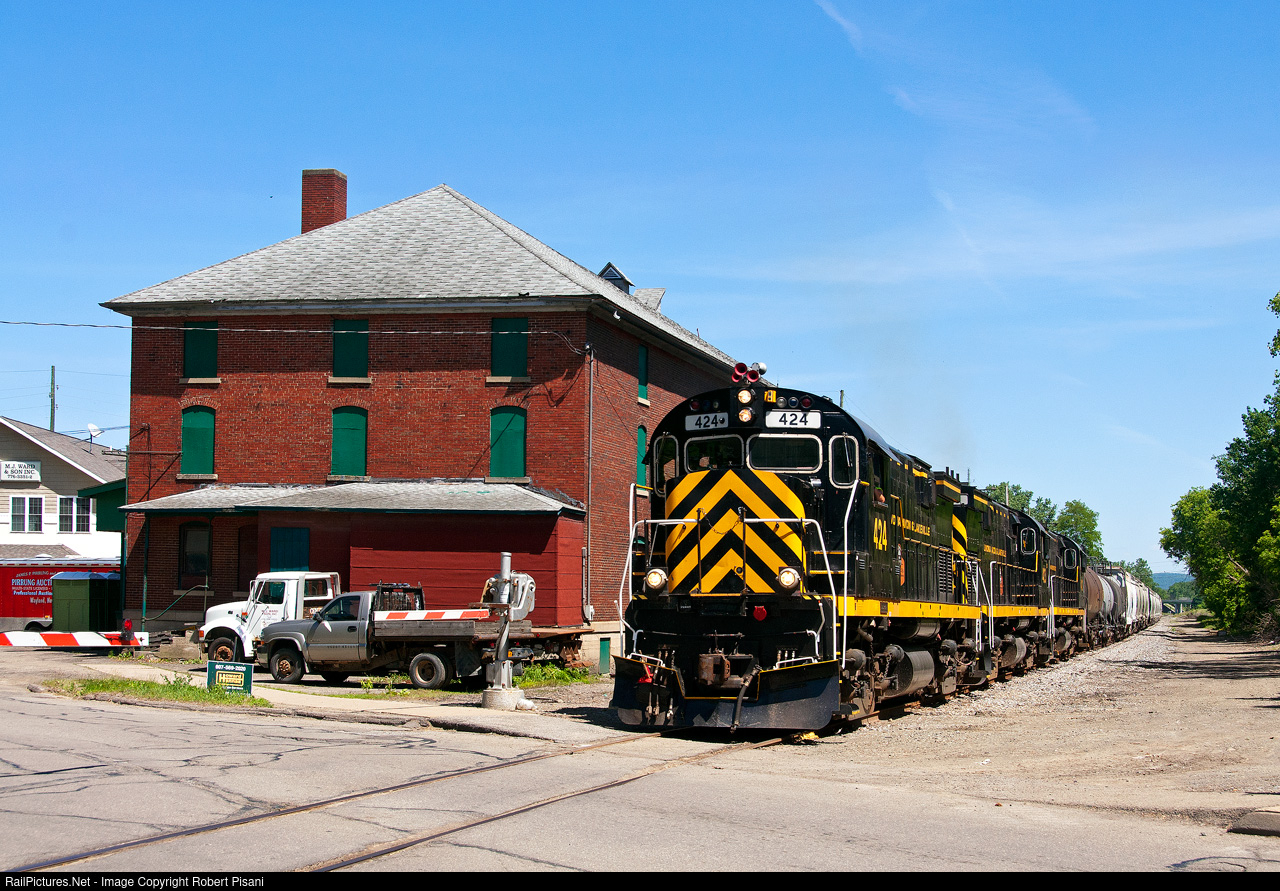 A Bath & Hammondsport job led by three consecutively numbered C424s (424, 423, 422) passes the M.J. Ward & Son feed dealer in Bath, NY. These units are technically on "home" rails, all having been built for Erie Lackawanna in 1963. The right of way the train is operating over once saw the Erie and Delaware Lackawanna & Western railroads running parallel through town. I believe the tracks closest to the feed dealer actually belonged to the Erie. At the time of this photo, these units were 55 years old and still earning revenue in the territory of their original owner.