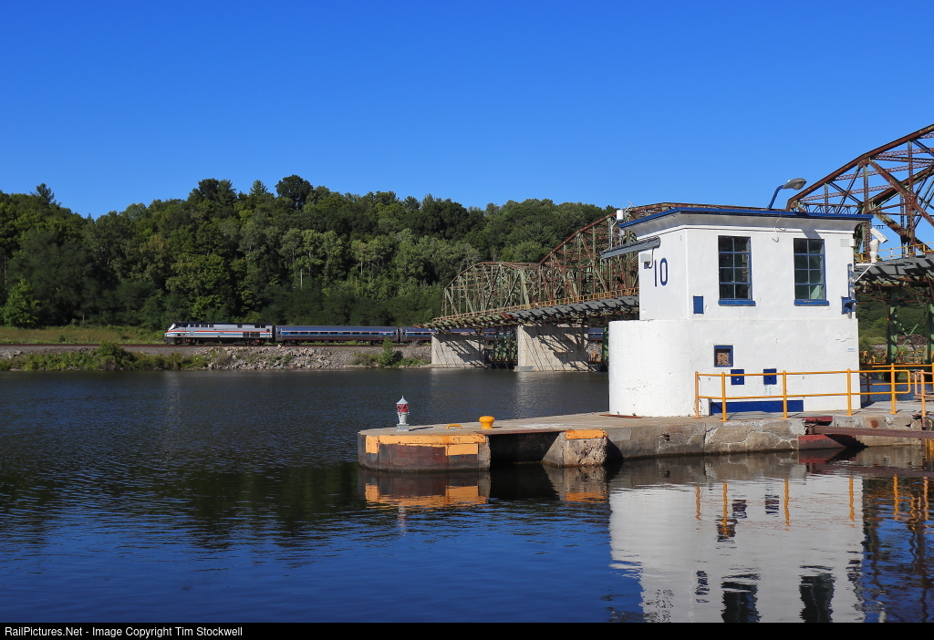 On a beautiful afternoon, Amtrak Train 283 breezes by Lock 10 on the Mohawk River / Erie Canal.