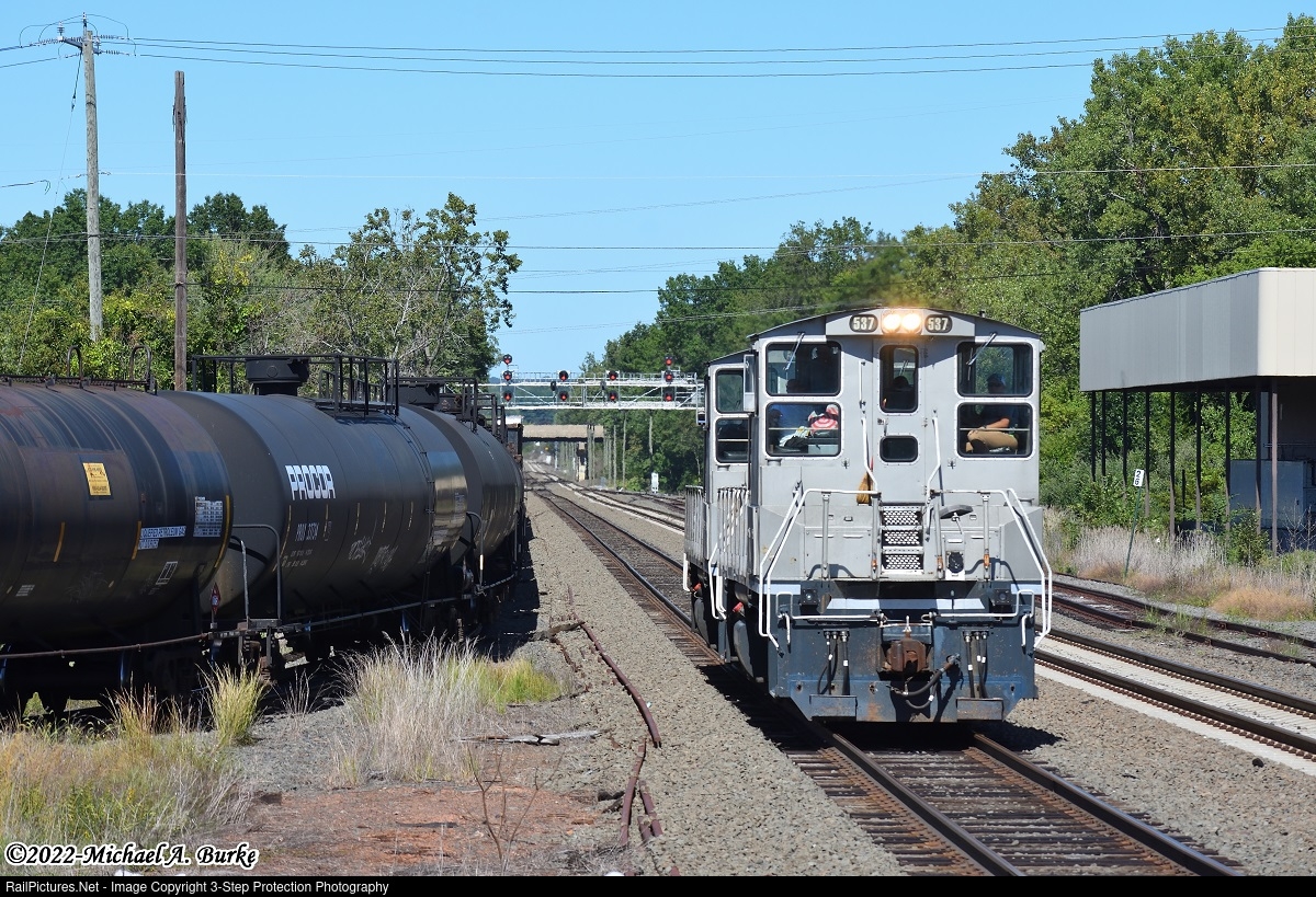 | A pair of Amtrak MP15ACs return light to New Haven after dropping a rail train on the Parkville Industrial in Hartford. The tank cars on the left are of train EDPL from East Deerfield to Plainville, which was stopped awaiting a recrew. |