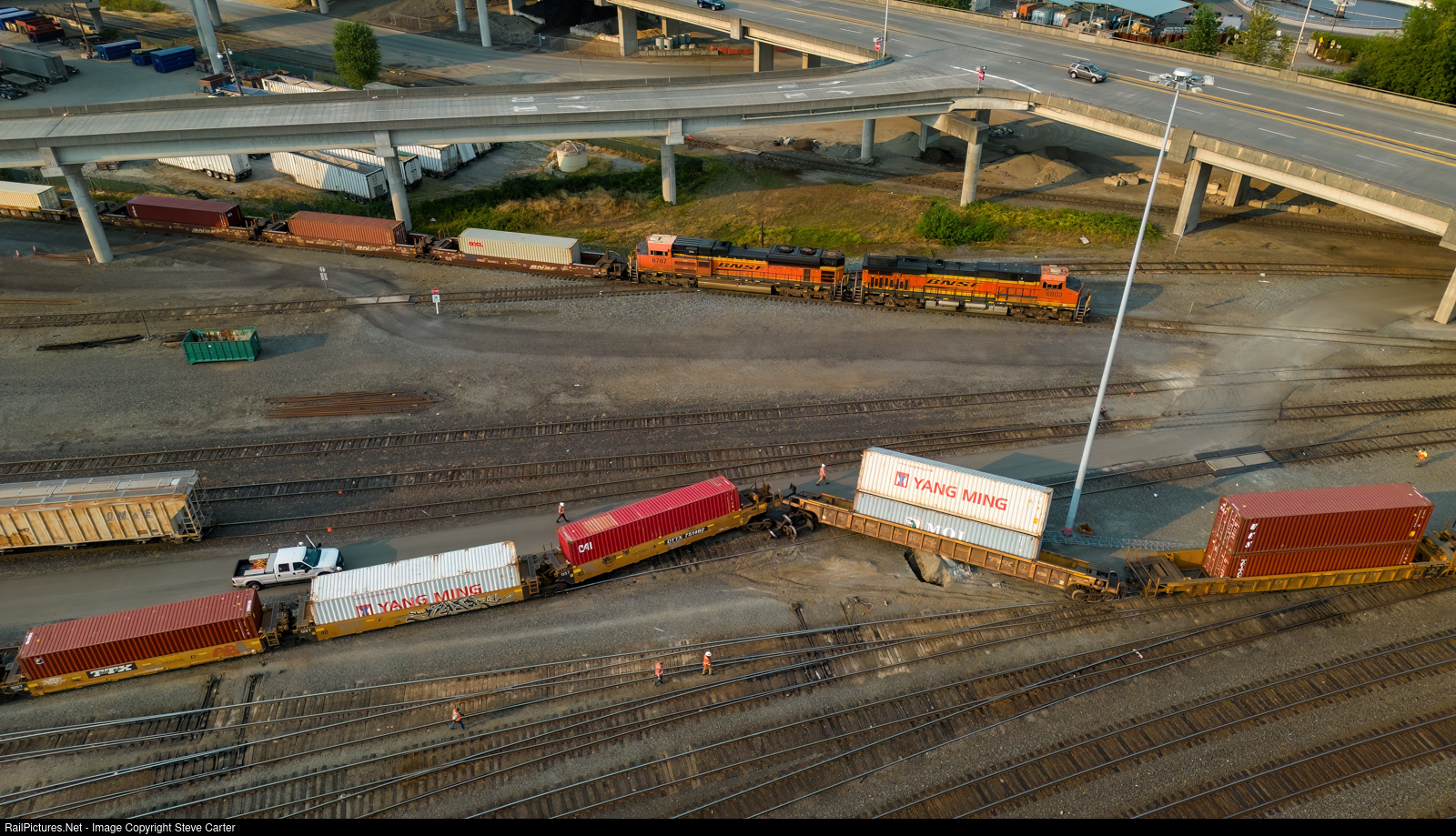 Still trying to figure this one out. About 4 pm, this intermodal train was shoving in to the yard, or at least that what it sound like over the radio. The shove is from right to left. On the left side out of the shot are a cut of commercial cars coupled on to this train. The portion of the train not derailed to the right has been cut away and now being shoved in to the Log yard.