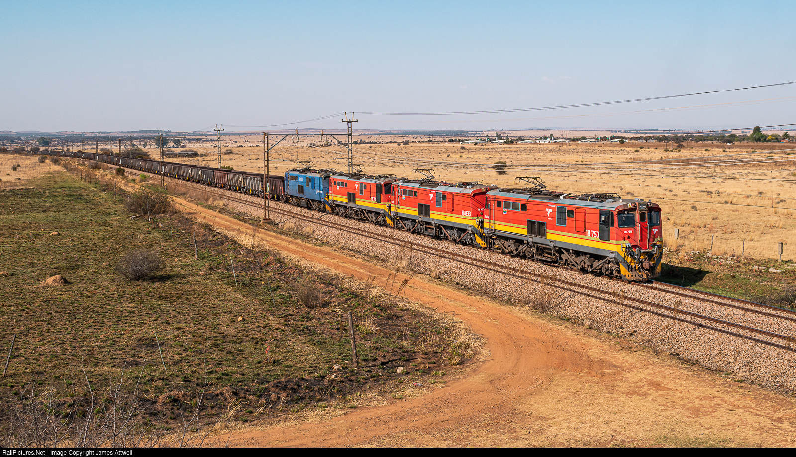 On a warm (soon-to-be) spring afternoon, four Transnet Freight Rail Class 18Es and their long empty consist tackle the gradient between New Machavie & the R56 road bridge, between Potchefstroom & Klerksdorp.