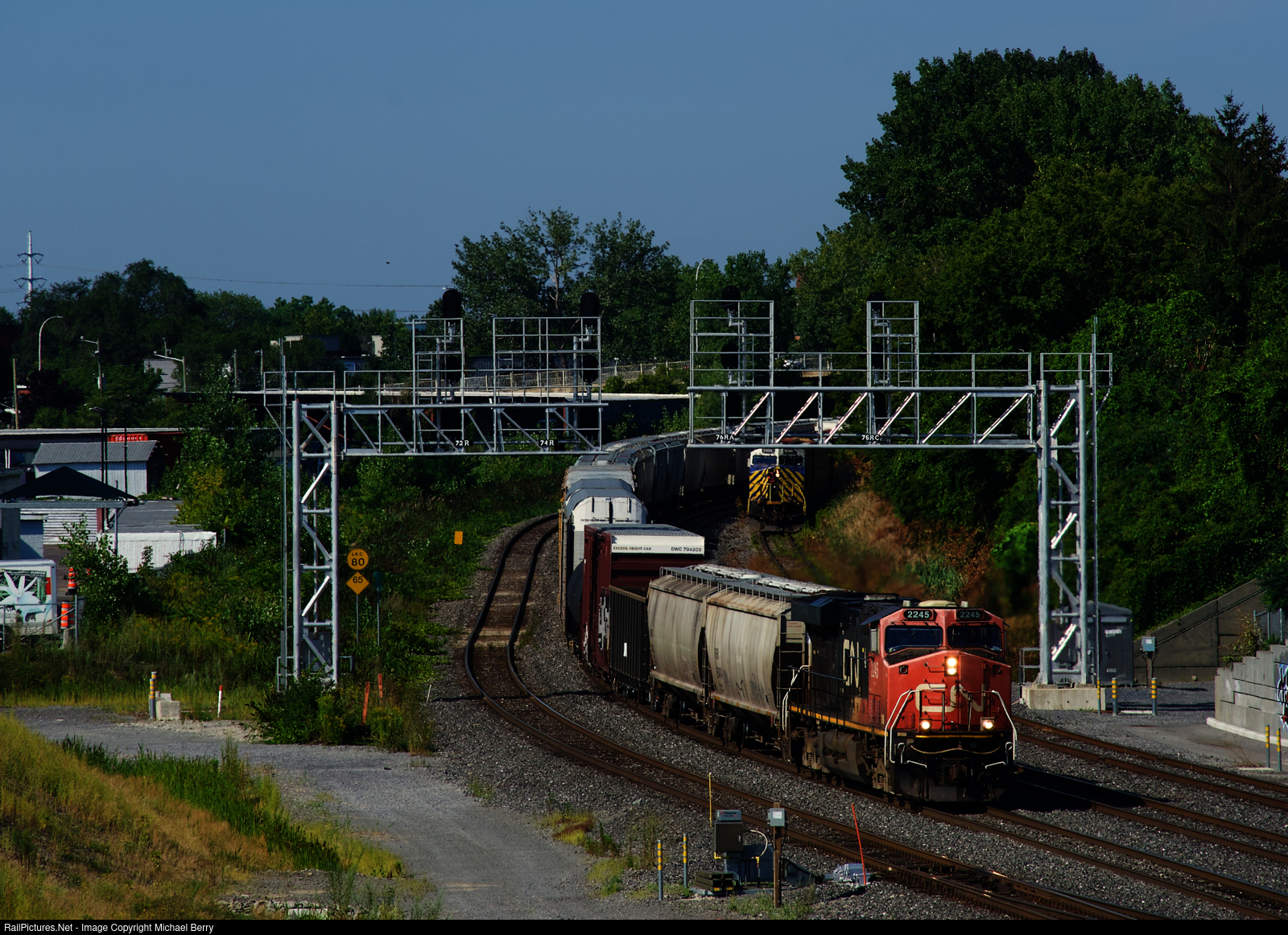 | CN 310 in the background. After spending the night tied down at Lachine, CN 306 is heading east with a fresh crew onboard. In the distance at right, CN 310's conductor gets back on the leading unit after they finished setting off cars on the Transfer Track. |
