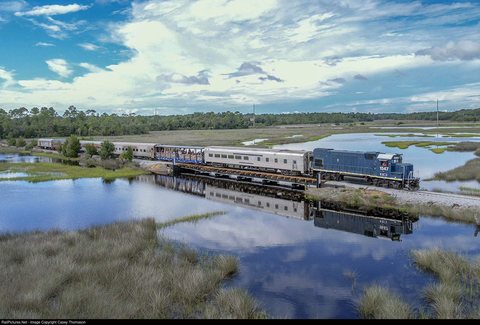 | Georgia Coastal Railway's 3:30 "Georgia Coastal Railway Experience" excursion train crosses the St Marys River as it approaches St Marys, Georgia. You too can ride this train! Visit www.thegeorgiatrain.com for ticket info. |
