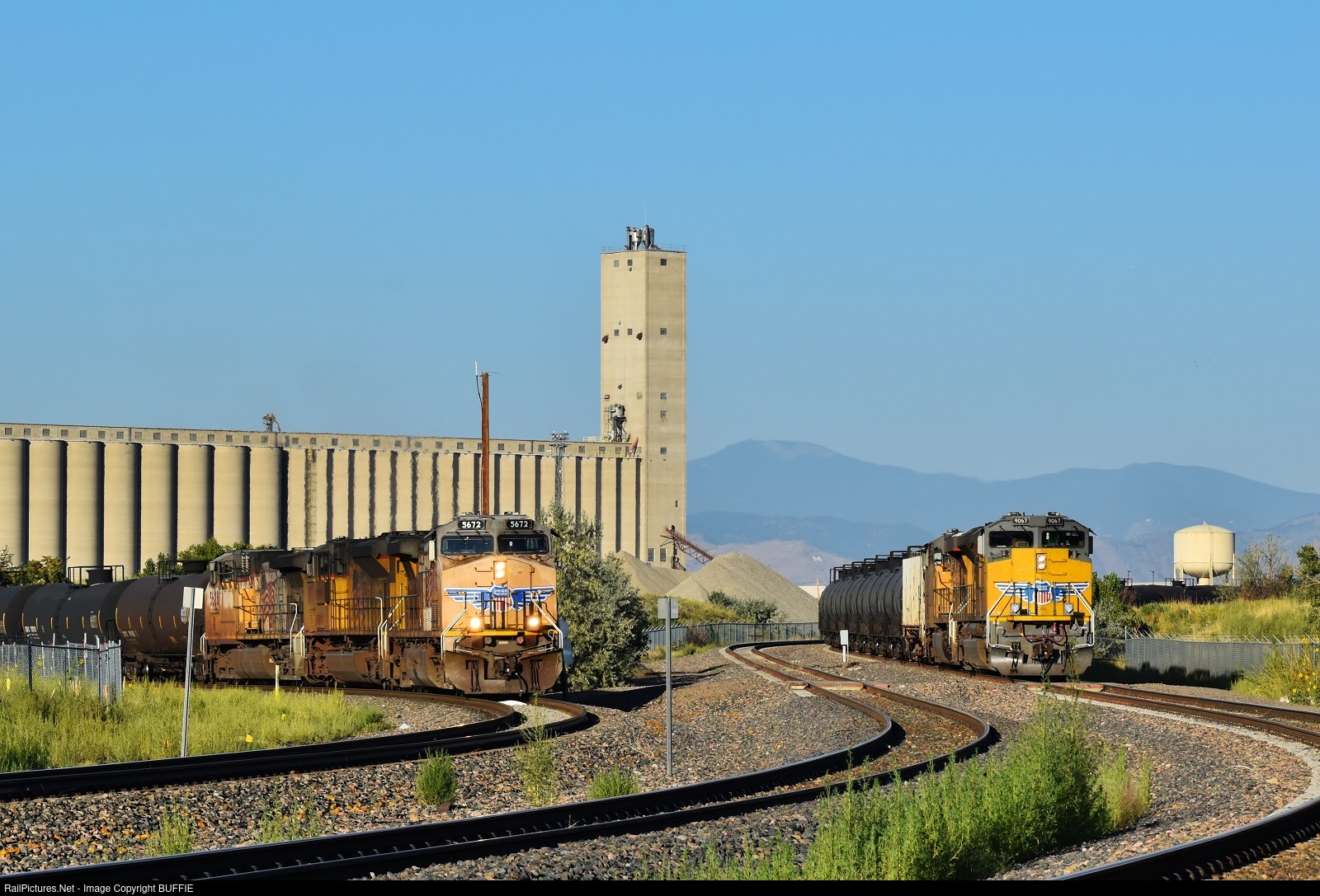 Two Union Pacific trains hold at the Broadway Bypass before getting a green signal to head towards the Greeley Sub via the Utah Belt through North Denver.