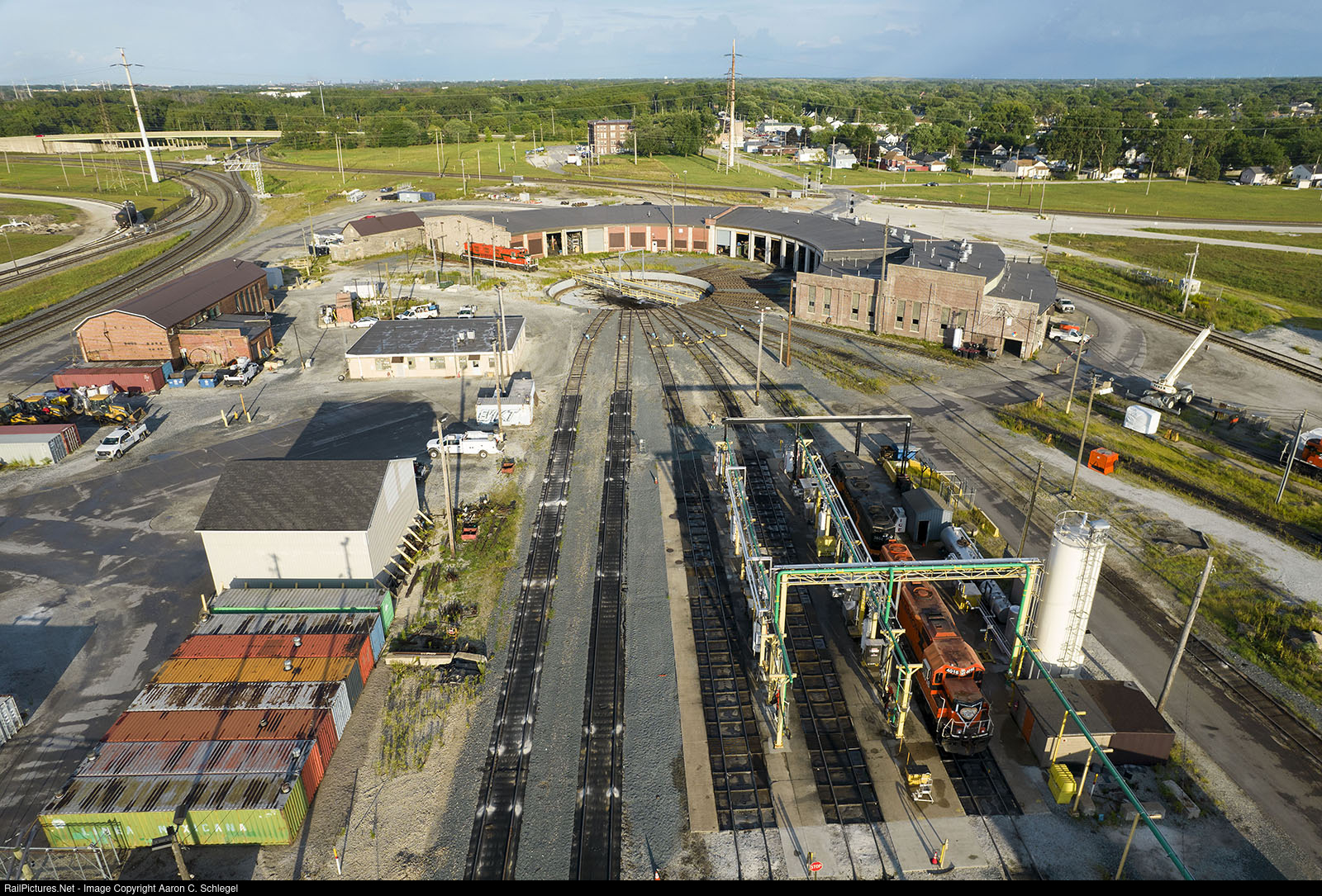 | The 4016 and 3802 sit on the fuel pad just outside the IHB Gibson Roundhouse. A newer Gen Set the IHB 2161 waits by the house for servicing. The still active Roundhouse is one of few surviving the modern age of railroading. |