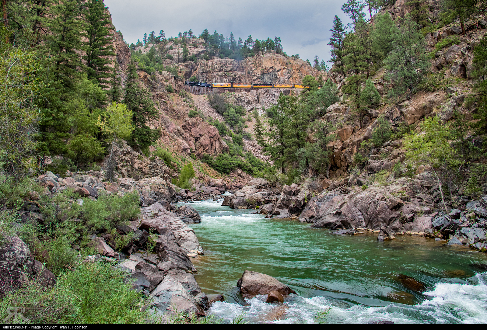 | Unfortunately for those familiar with CW McCall's song "The Silverton Train," the Animas River Gorge only finds itself 230-ish feet from rail to river, as opposed to the 400-feet McCall suggested in the tune. Still impressive nonetheless, and here's train 464 en route back to Durango seen from river level navigating the horseshoe curve on the famous "High Line." |