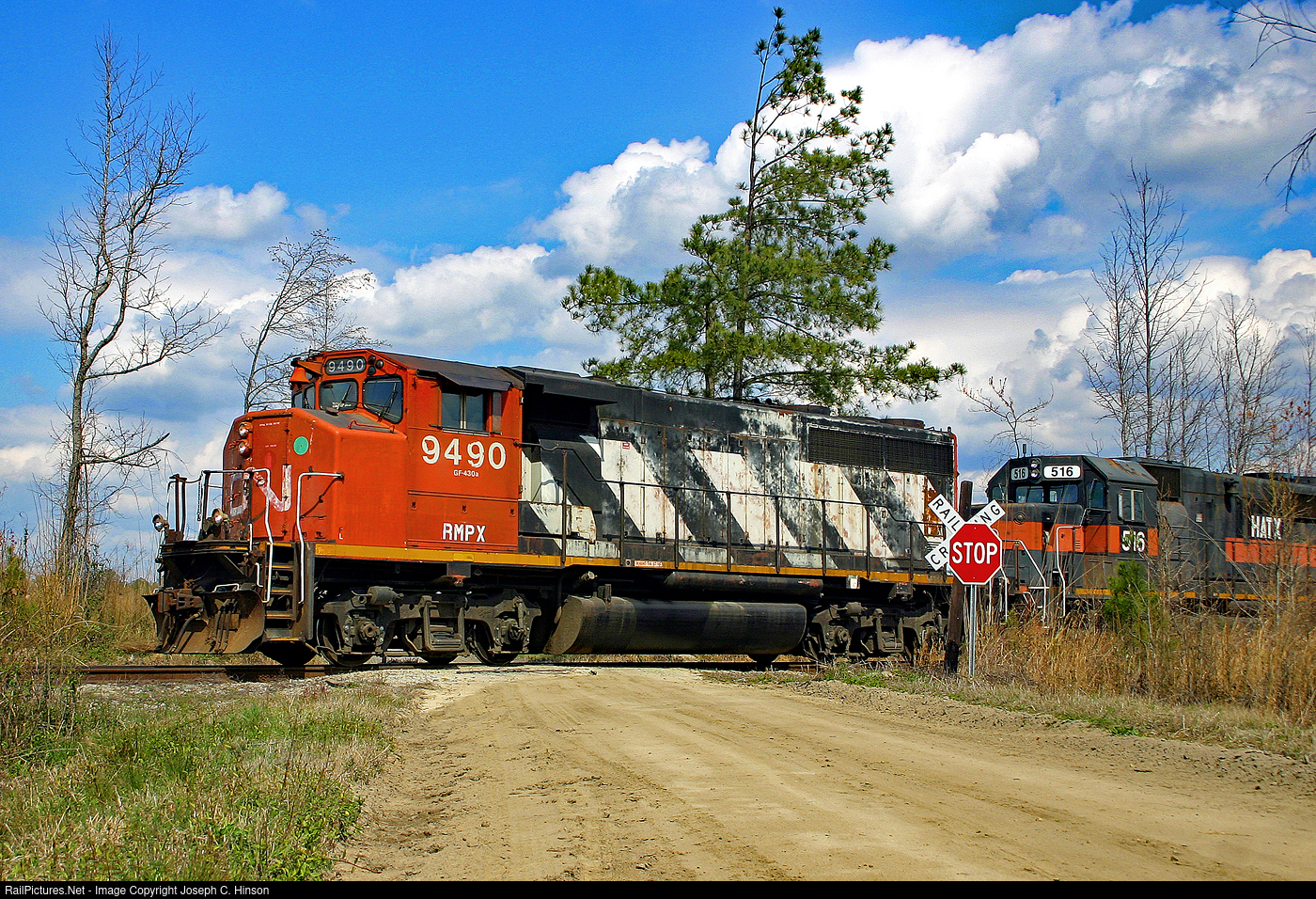 | South Carolina Cental Railroad crosses a very rural road just outside Hartsville on the trip to Bishopville. Former Canadian National GP40-2L #9490 is on point wearing RMPX reporting marks. Those would eventually be replaced by SCRF marks belonging to the South Carolina Central. The locomotive is no longer on the shortlines roster. |