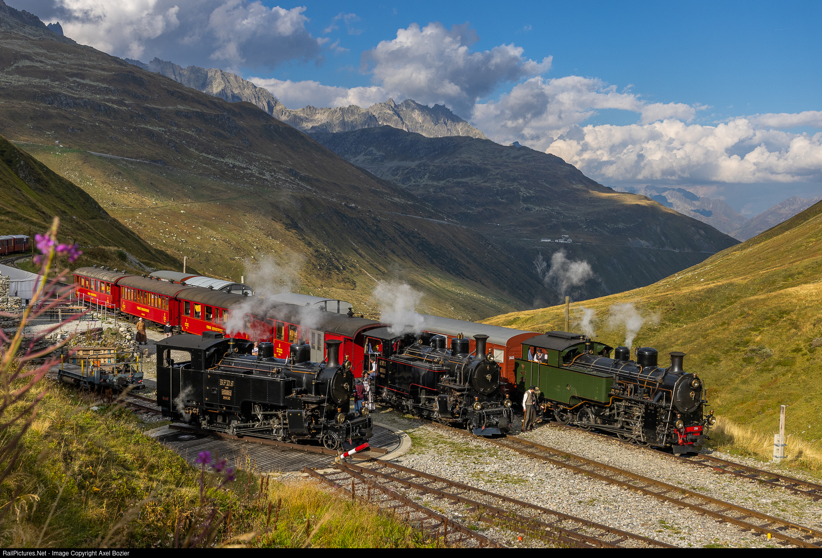 An unusual meeting of three SLM cogwheel steam locomotives at the Furka station (2,163 m / 7,096 ft above sea level) on the Dampfbahn Furka Bergstrecke (DFB): HG 3/4 #9 "Gletschhorn" from 1914, HG 3/4 #4 from 1913, HG 4/4 #704 from 1923 originally built for Vietnam. Note the passengers in period clothing.