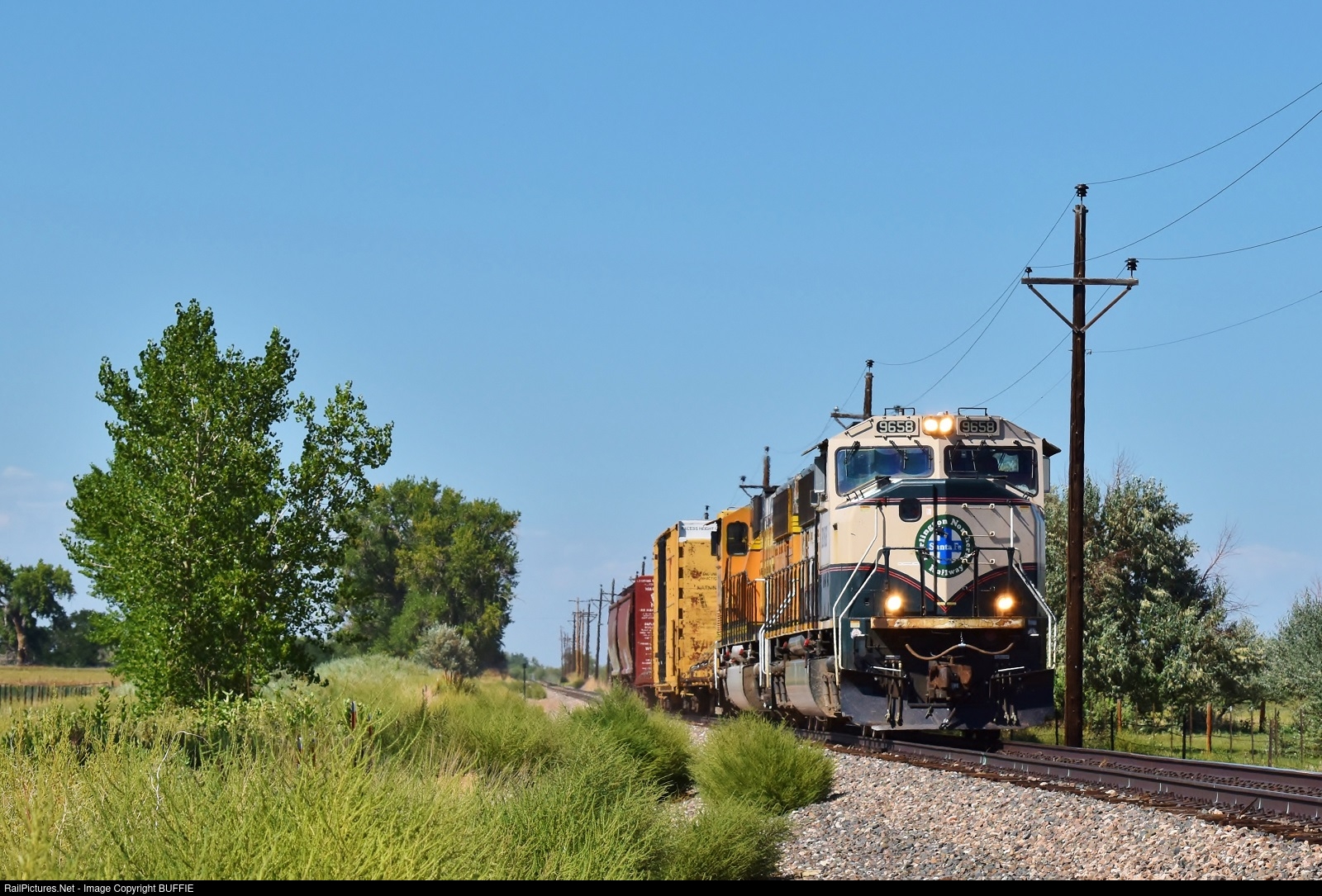 | BNSF 9658 sporting an Executive Grinstein wagon wheel paint scheme (SD70MAC) heads south on the Front Range Sub towards Longmont, Colorado.