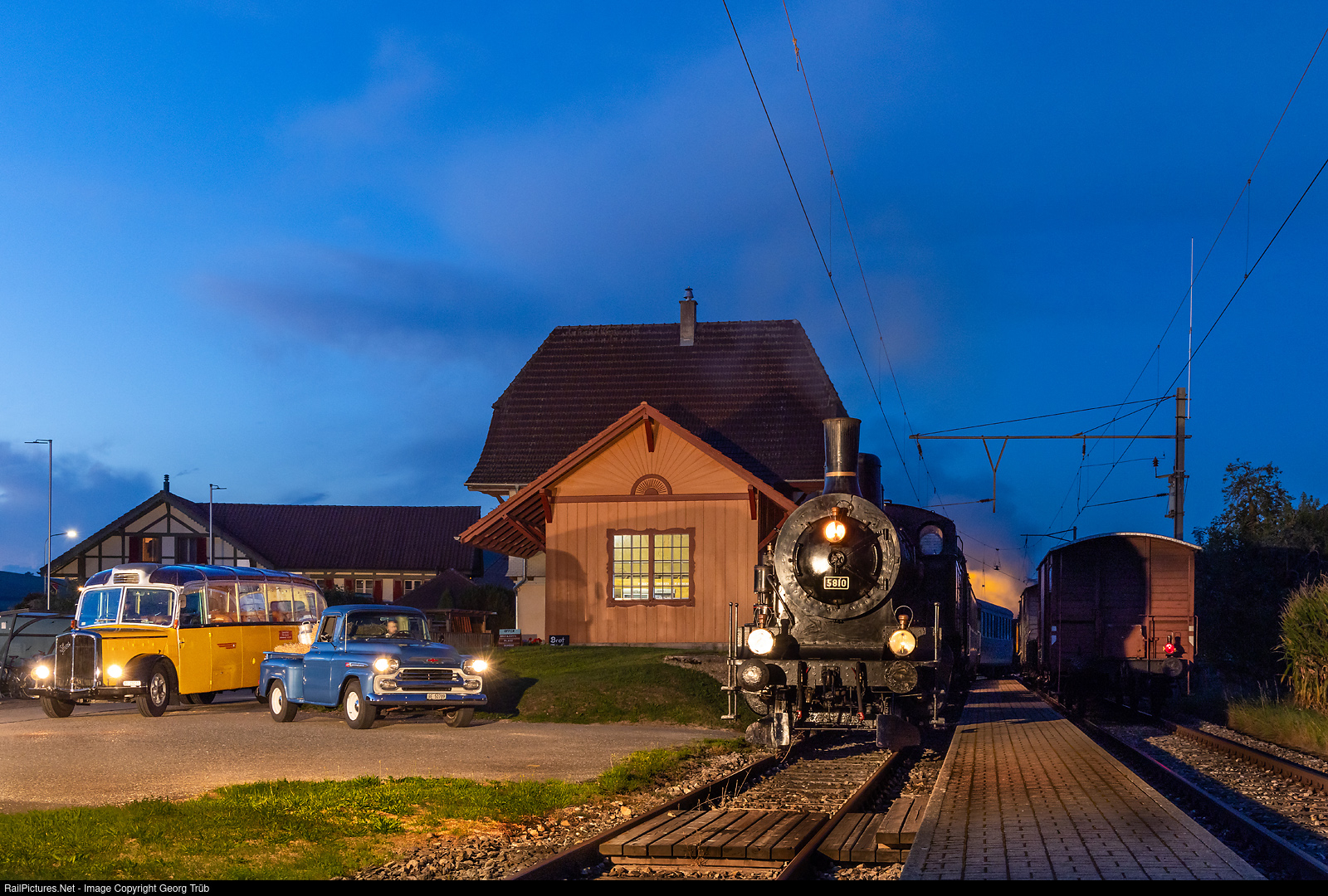 Night is falling in Häusernmoos in the Emmental. The steamtrain with Eb 3/5 # 5810 from Huttwil to Ramsei stopped for a crossing and connection with the post bus. A P.M. night photo event.
