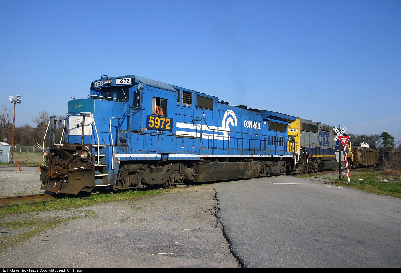 | CSX 5972 was one of two motors as the crew of CSX Y102 is on a spur off of the Eastover Sub in Columbia, South Carolina. The old GE has an unusual ancestry. Built as Conrail #5079, it went to Norfolk Southern initially after the split as NS #4810. CSX got it in a locomotive swap. It was then retired and was sold to the Maine Central. I am not aware of its current disposition. |