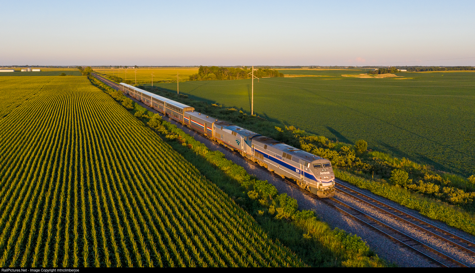 | Running about an hour and a half behind schedule, Amtrak's westbound California Zephyr catches the last light of the day as it speeds past farm fields in Batavia, Iowa on BNSF's Ottumwa Sub. In the lead is GE P42DC AMTK 184, the Phase IV heritage unit that was one of several painted in 2011 for Amtrak's 40th Anniversary. |