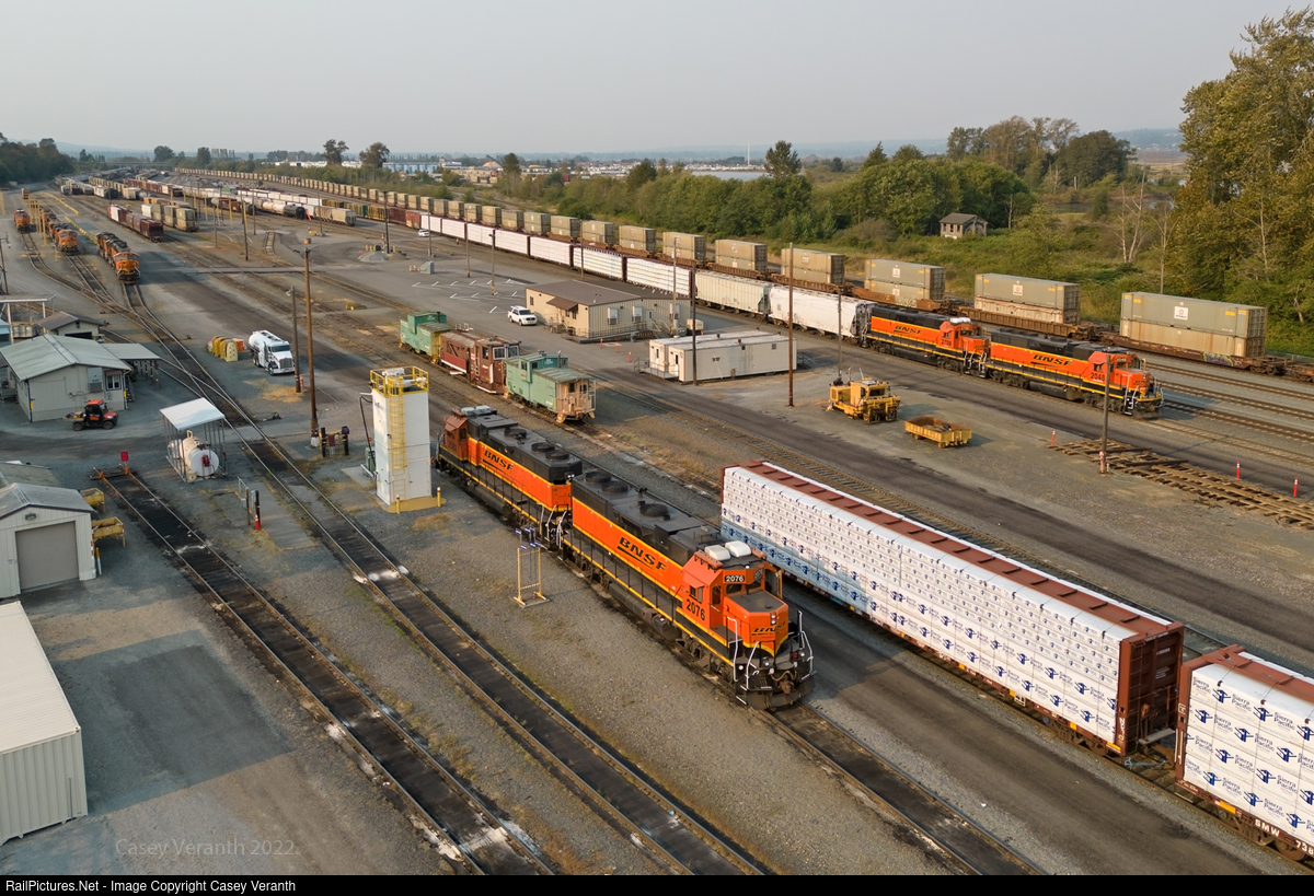 | Smoke from fires a 14-hour drive away in California has made it to the northwestern part of Washington State today, leaving a strange color in the air. Everett's Delta Yard is a flat yard and a funnel point for Canadian traffic. The region north of Everett is also home to many EMD geep road switch jobs and was one of the last parts of the system to use cabooses on mainline freights until just after the BNSF merger. |