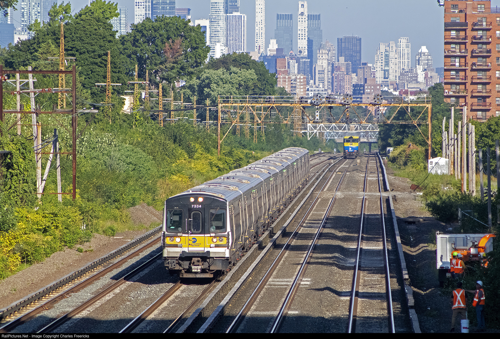 A set of Bombardier M7s heads east, about to pull past the station in Forest Hills, while in the distance a DE30AC shoves a Long Island City bound train away.