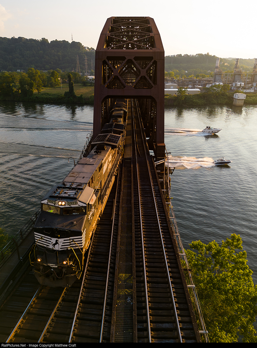 It's neck and neck as two boats race off into the sunset under an eastbound coal train. NS 9922 is diverging onto the Island Connector, which will send this train down the ramp and through the NS Island Avenue Yard and out onto the Conemaugh Line. |