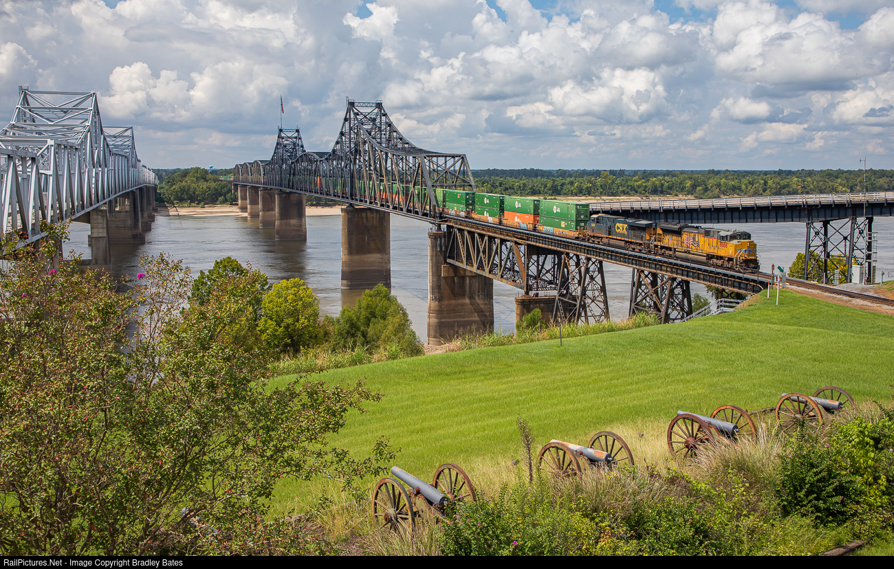 Kansas City Southern Intermodal Train K-LBNS heads east across the Mississippi River into Vicksburg, MS.