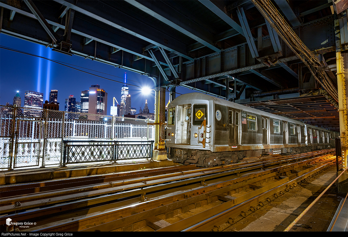 On the night of September 11th, 2021, A New York City Transit garbage train, led by St. Louis Car Company R42 #4792, heads south over the Manhattan Bridge on the BMT Broadway Line in Manhattan. The 9/11 "Tribute In Light" memorial installation can be seen shining over the city skyline in the distance.