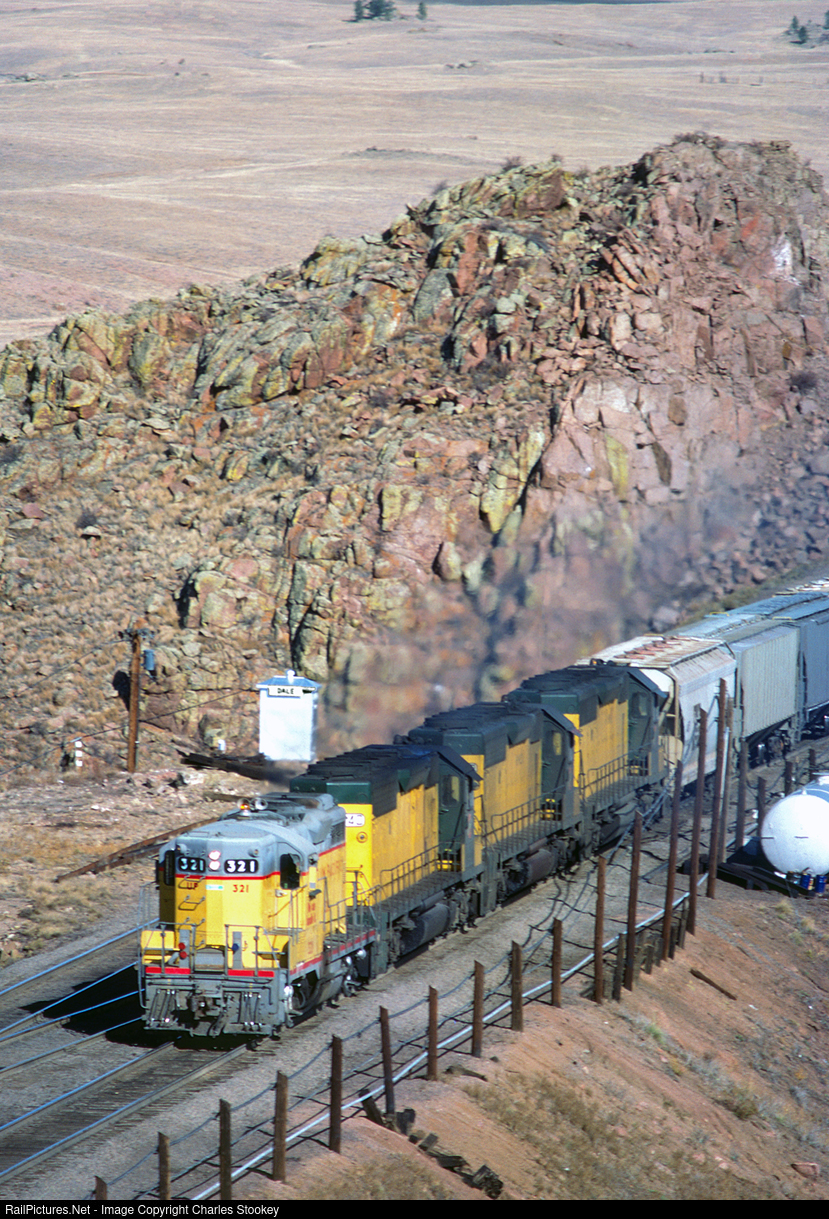 | DALE WY Oct 19 1977 — Union Pacific GP9 321 is westbound on the number two track after leaving the number three track (the alternate main line) on the way to Laramie. The alternate main line was opened on May 12 1953. My photo. |
