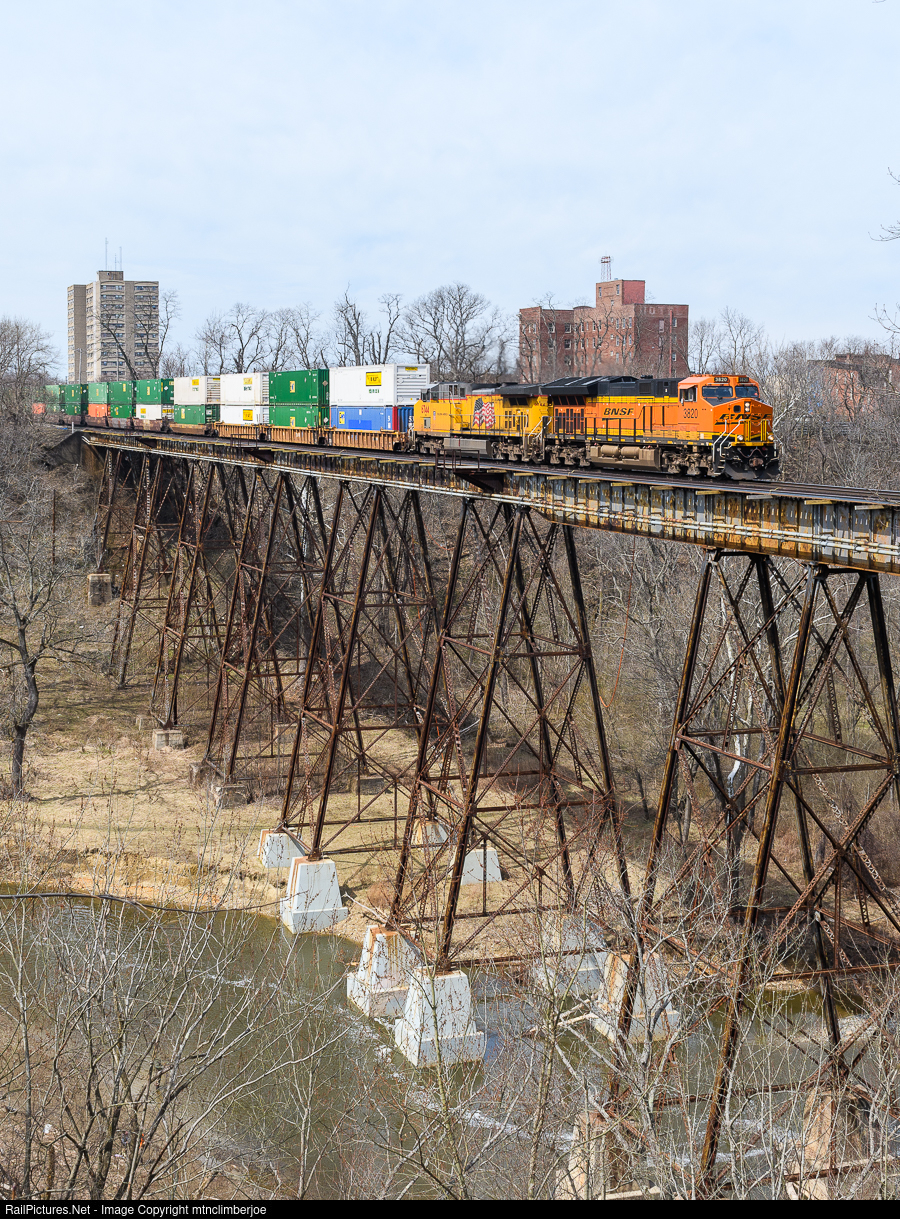Norfolk Southern intermodal 22K has a pair of foreign power leaders in the form of a BNSF and UP GE, powering the train eastbound as it soars high above the Ashtabula River on the trestle in Ashtabula, Ohio. The train has just crossed over the diamond with the NS Youngstown Line located on the west side of the river.