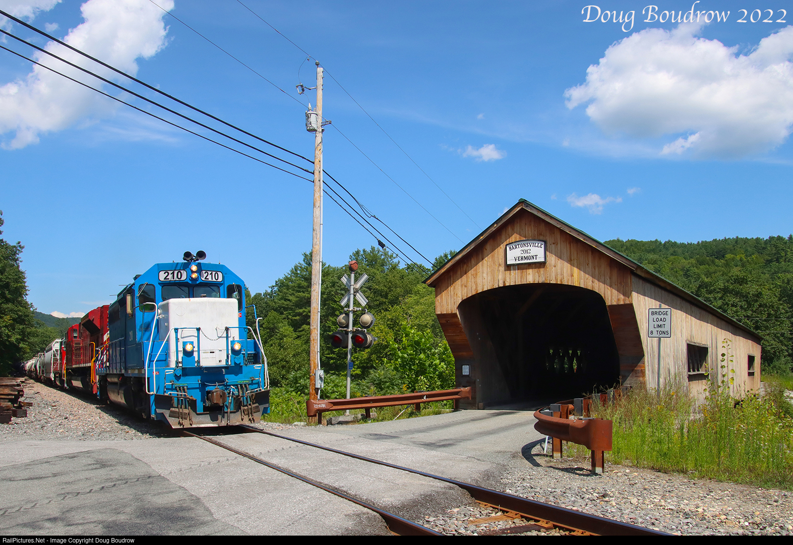 Vermont Rail Systems train 263 is seen passing the covered bridge at Bartonsville.